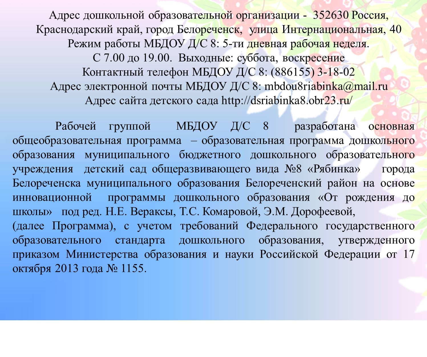 ГОРОД ИЖЕВСК УДМУРТСКАЯ РЕСПУБЛИКА E-mail: ds230@izh-ds.udmr.ru Заведующий Тихонова Татьяна Тимофеевна Адрес официального сайта: http://ciur.ru/izh_dou/izh_ds230 Информационные ресурсы организации: www.izh.ru/i/info/sad230.html Дата создания детского сада: 1 здание - 1979 год, 2 здание - 2015 год.